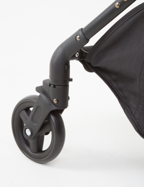 大型のホイールで安定した走行を実現!車輪は接地面の少ない、シングルタイヤ、360度の小回りが可能です。 ゴム製のタイヤは静音設計でマンションの共有部など、音の気になる場所でも静かに押すことが出来ます。